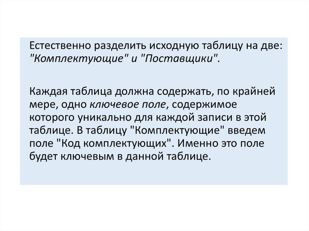 Естественно разделить исходную таблицу на две:"Комплектующие" и "Поставщики".