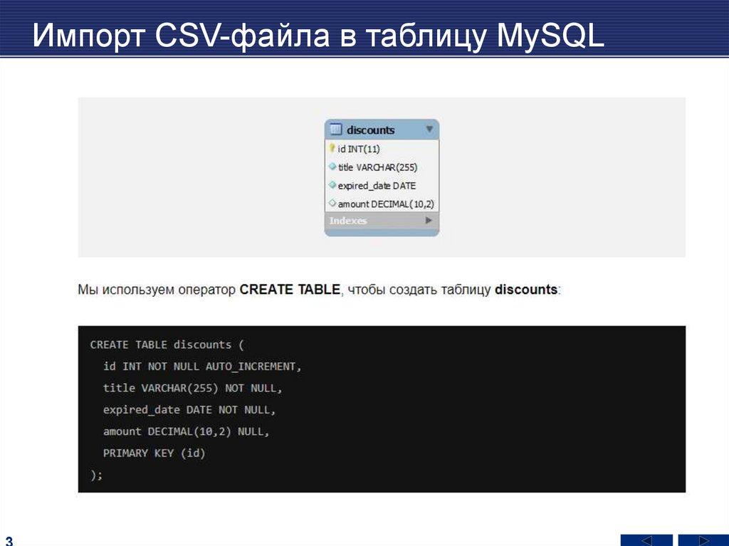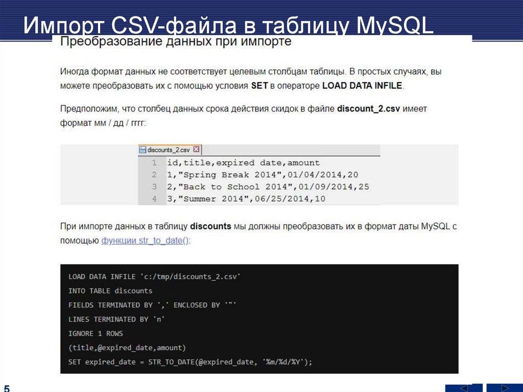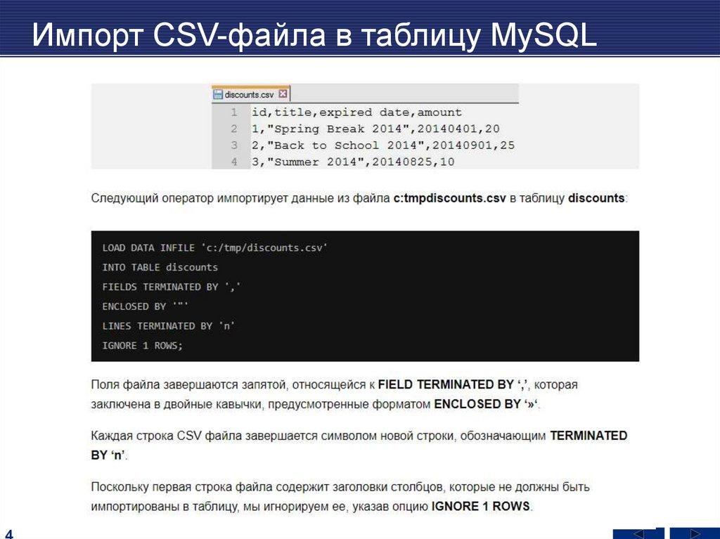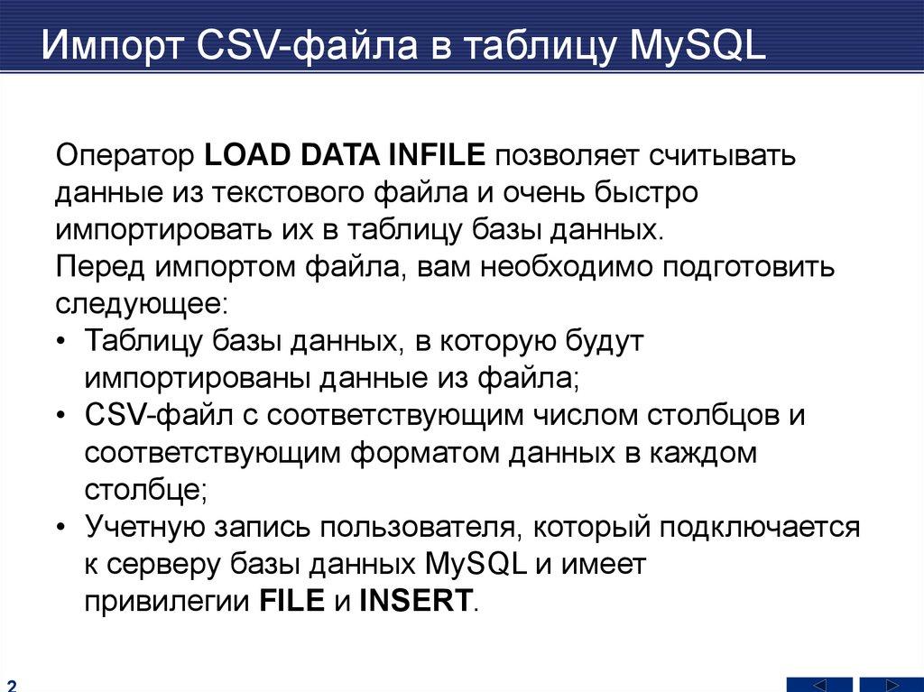 Импорт CSV-файла в таблицу MySQLОператор LOAD DATA INFILE позволяет считывать