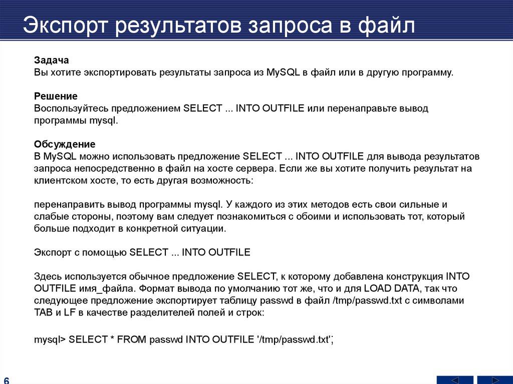 Вы хотите экспортировать результаты запроса из MySQL в файл или в другую программу.