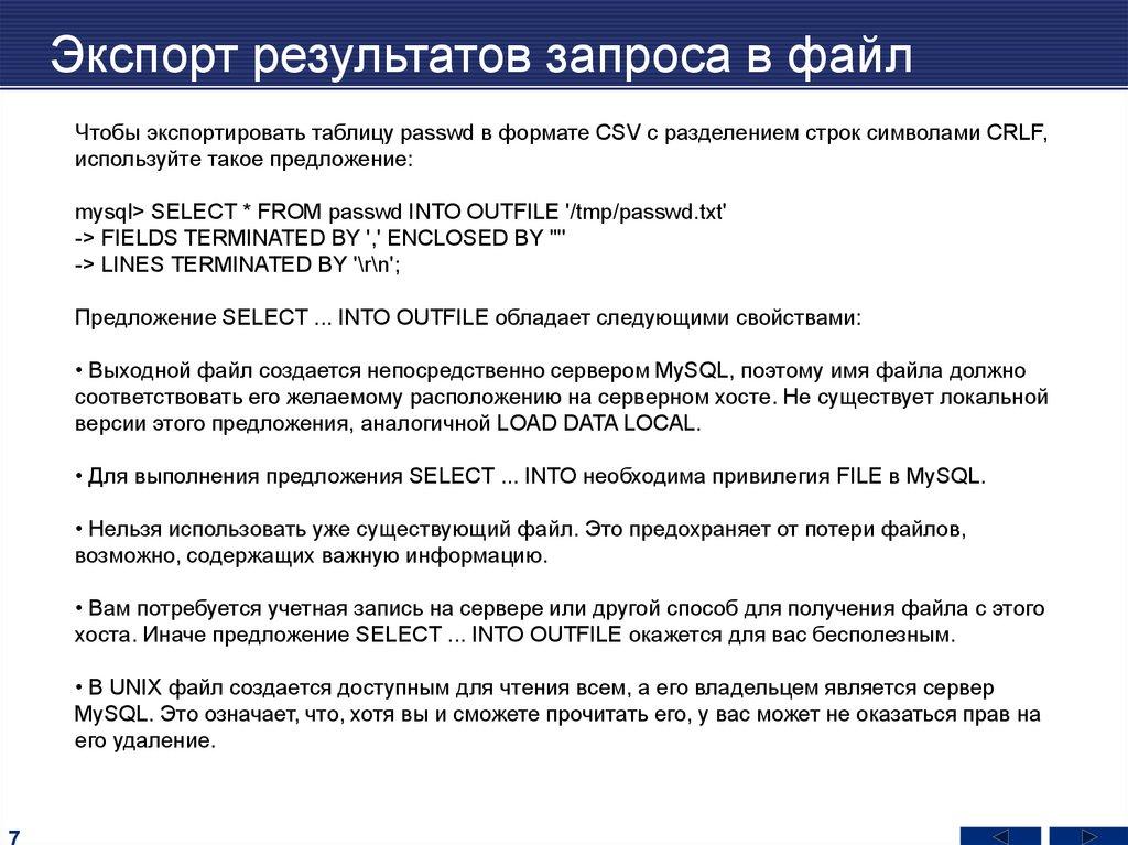 Экспорт результатов запроса в файлЧтобы экспортировать таблицу passwd в формате CSV с разделением строк символами CRLF,