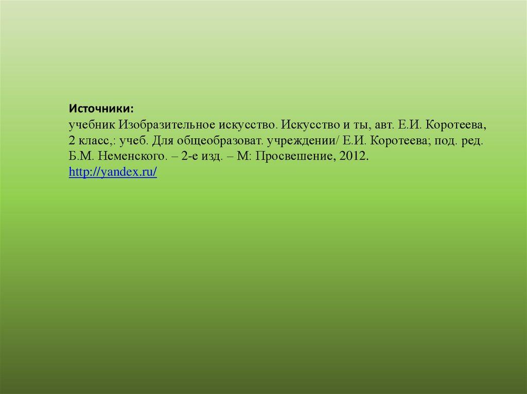 Источники:учебник Изобразительное искусство. Искусство и ты, авт. Е.И. Коротеева,