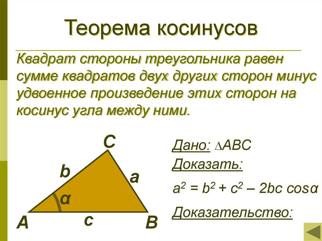 Теорема косинусовКвадрат стороны треугольника равен