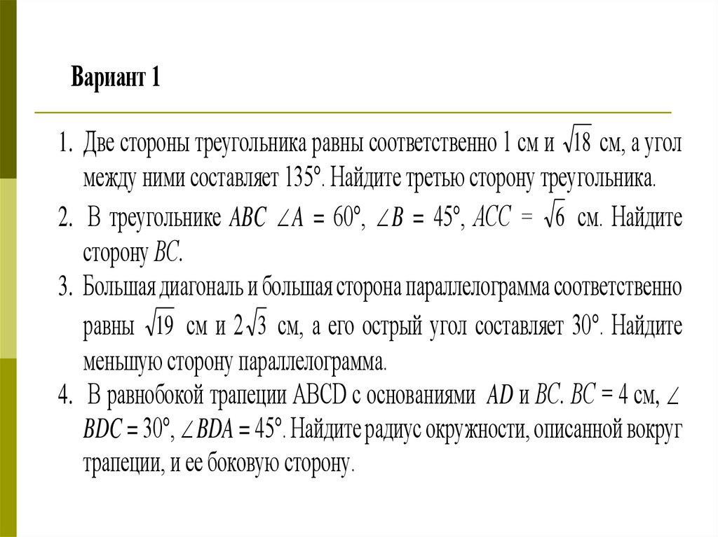 Вариант 11. Две стороны треугольника равны соответственно 1 см и 18 см, а угол
