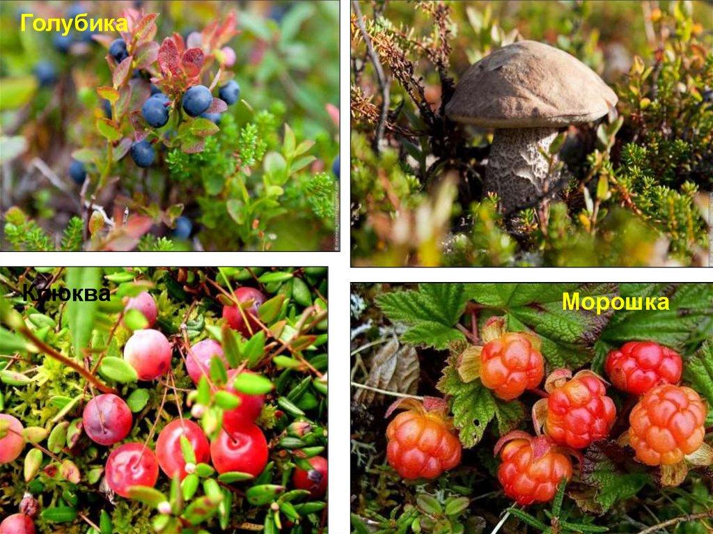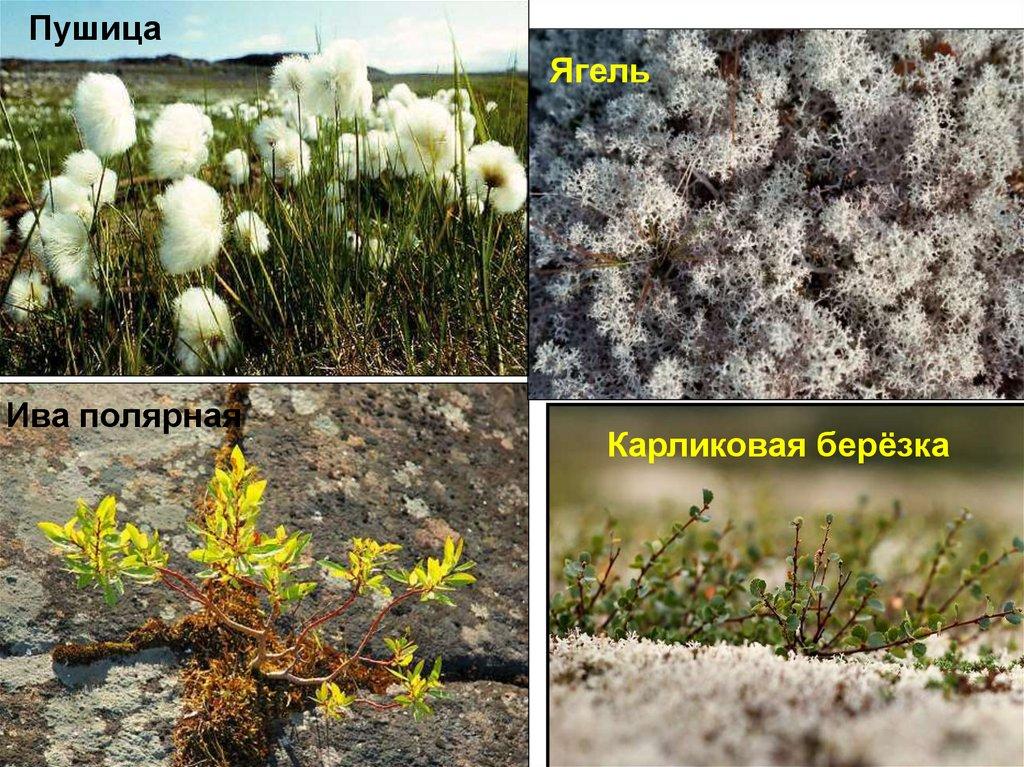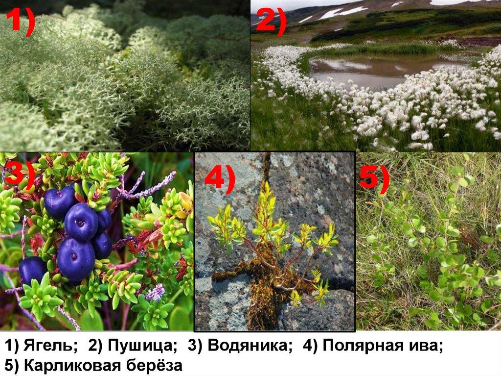 1) Ягель; 2) Пушица; 3) Водяника; 4) Полярная ива;