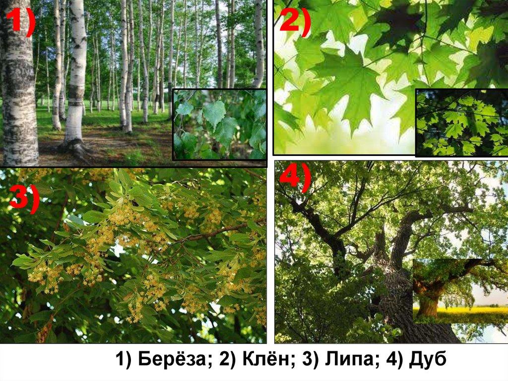 1) Берёза; 2) Клён; 3) Липа; 4) Дуб