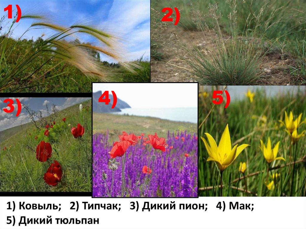 1) Ковыль; 2) Типчак; 3) Дикий пион; 4) Мак;