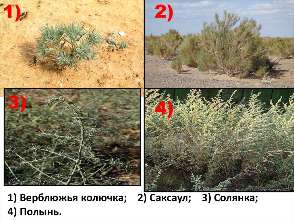 1) Верблюжья колючка; 2) Саксаул; 3) Солянка;