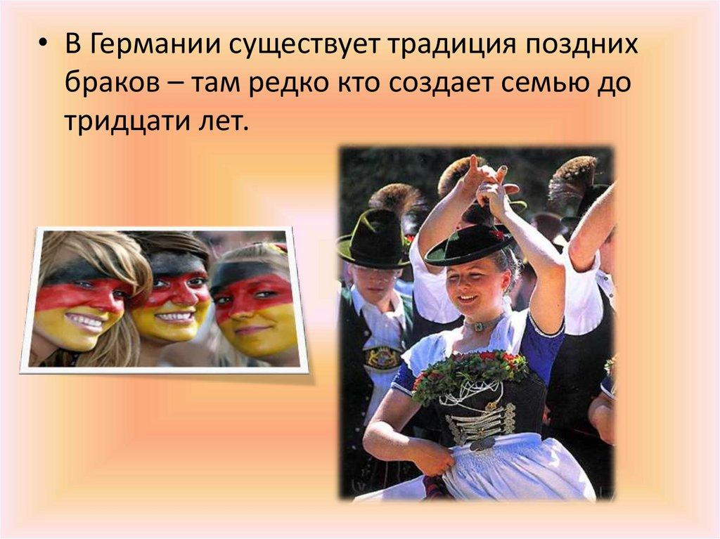 • В Германии существует традиция позднихбраков – там редко кто создает семью до