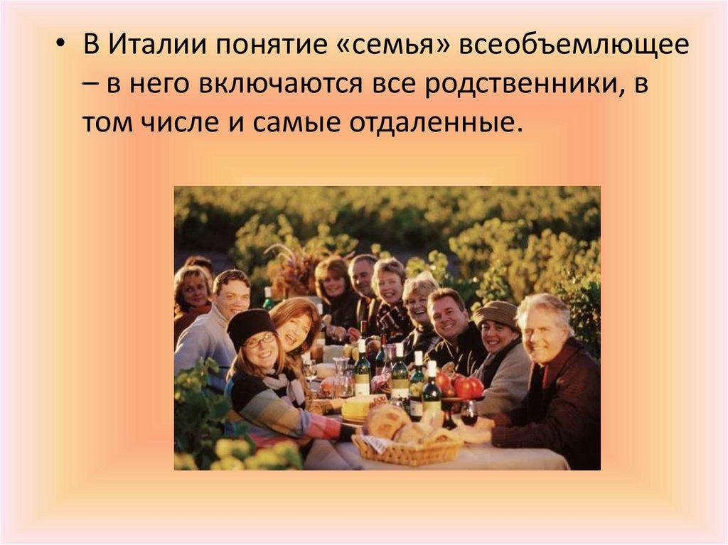 • В Италии понятие «семья» всеобъемлющее– в него включаются все родственники, в