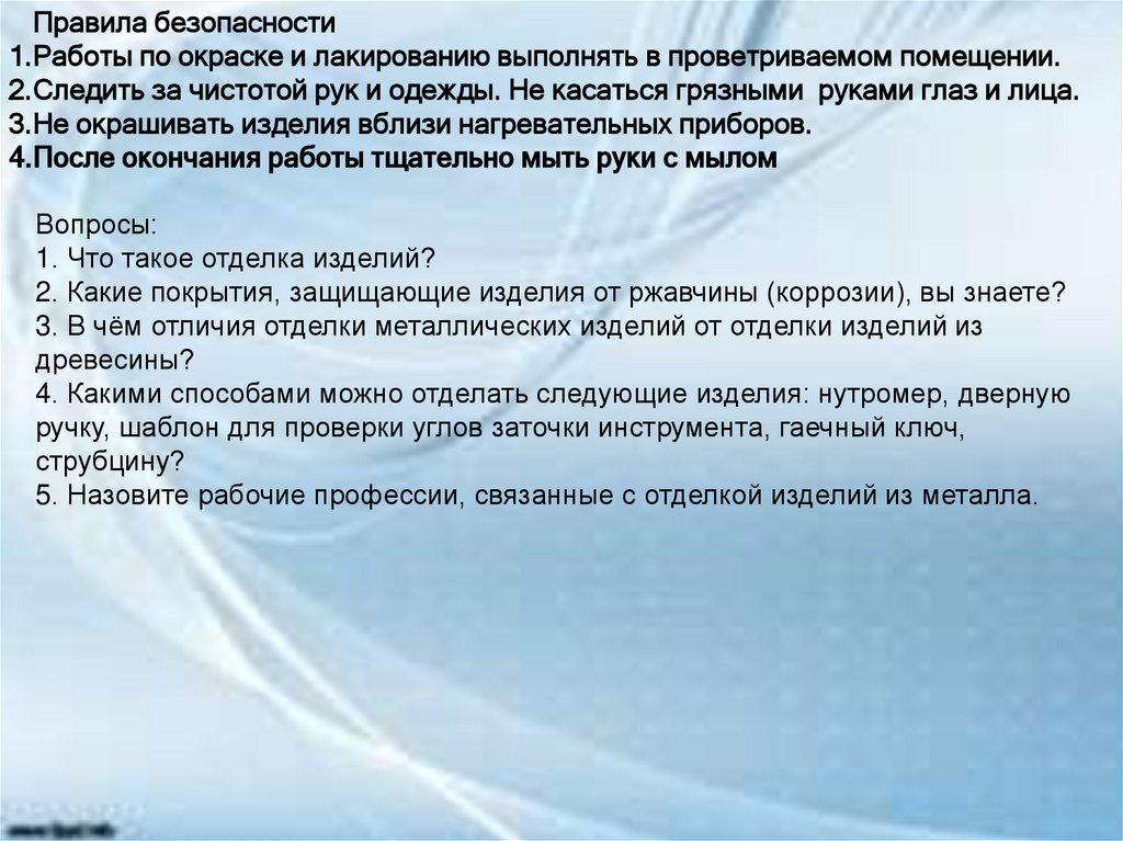 Правила безопасности1.Работы по окраске и лакированию выполнять в проветриваемом помещении.