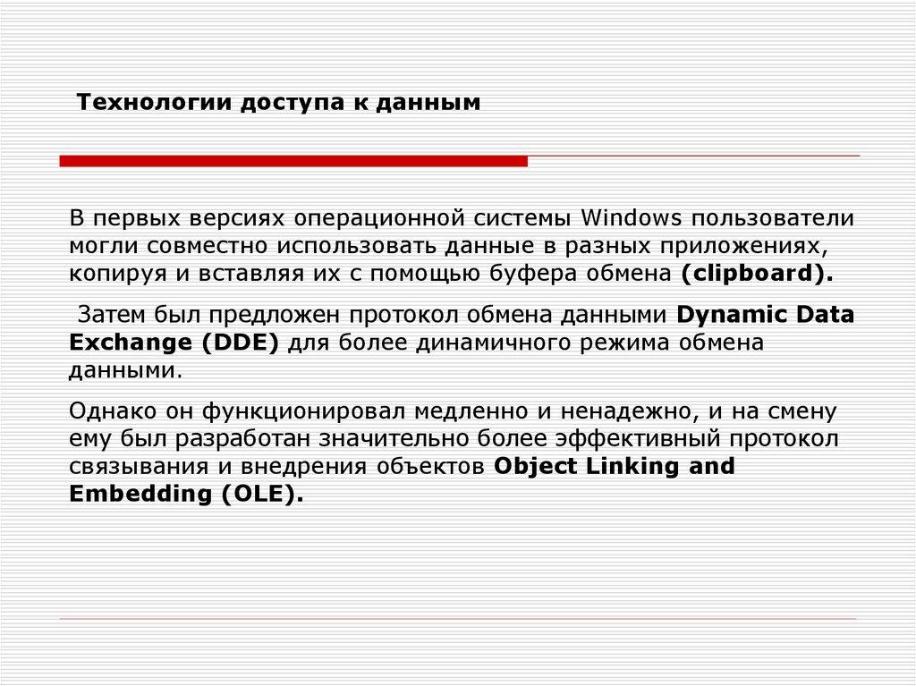 Технологии доступа к даннымВ первых версиях операционной системы Windows пользователи