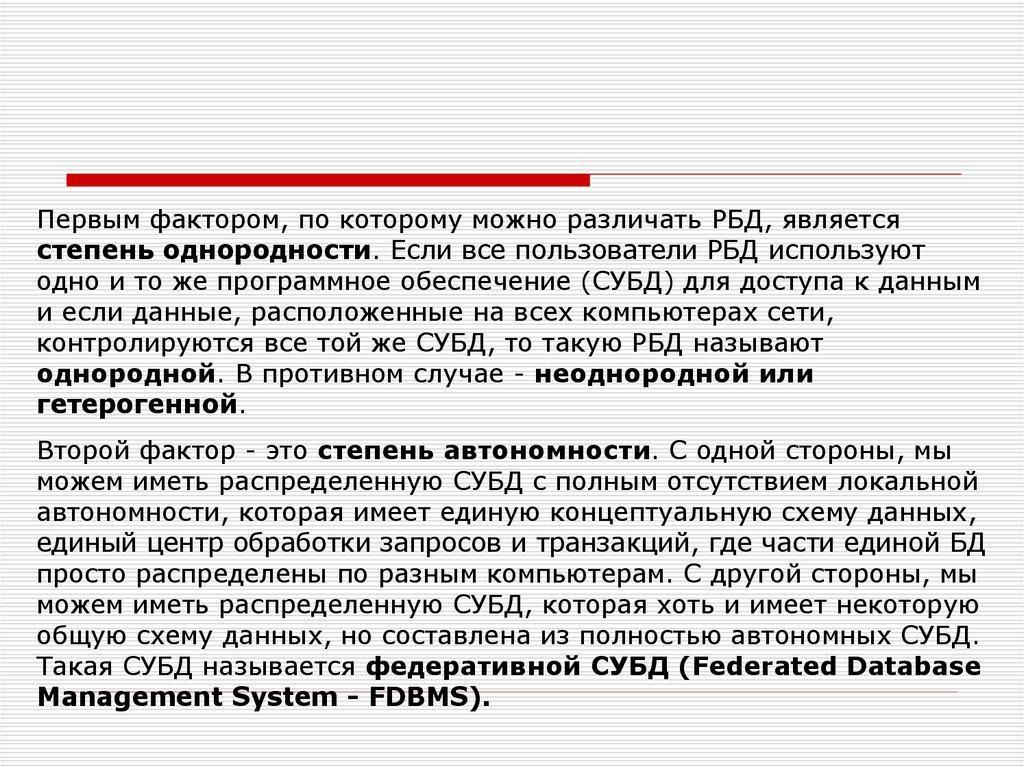 Первым фактором, по которому можно различать РБД, являетсястепень однородности. Если все пользователи РБД используют