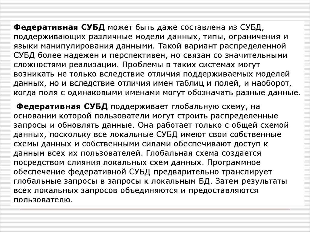 Федеративная СУБД может быть даже составлена из СУБД,поддерживающих различные модели данных, типы, ограничения и