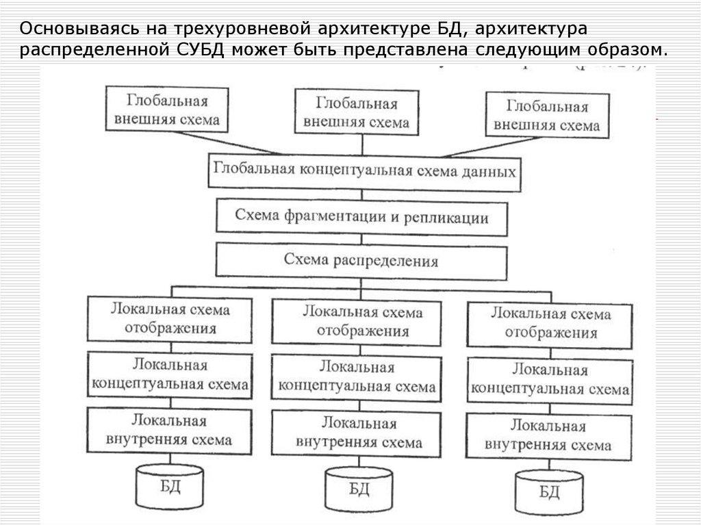 Основываясь на трехуровневой архитектуре БД, архитектурараспределенной СУБД может быть представлена следующим образом.