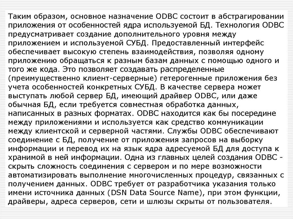 Таким образом, основное назначение ОDВС состоит в абстрагированииприложения от особенностей ядра используемой БД. Технология ODBC