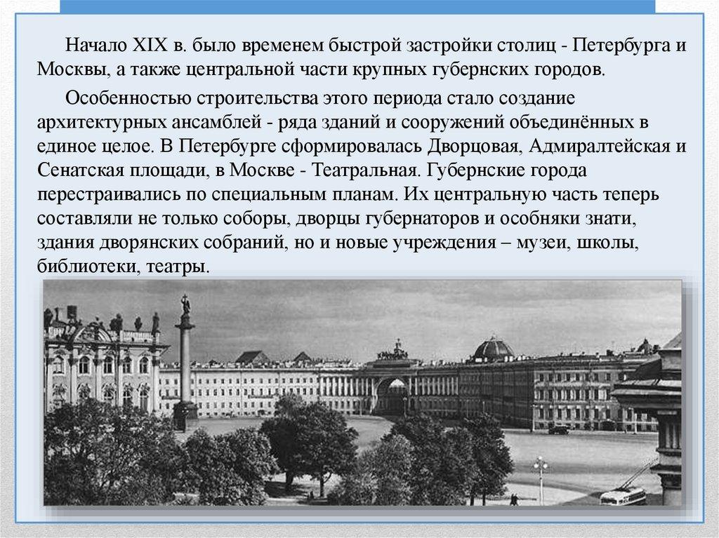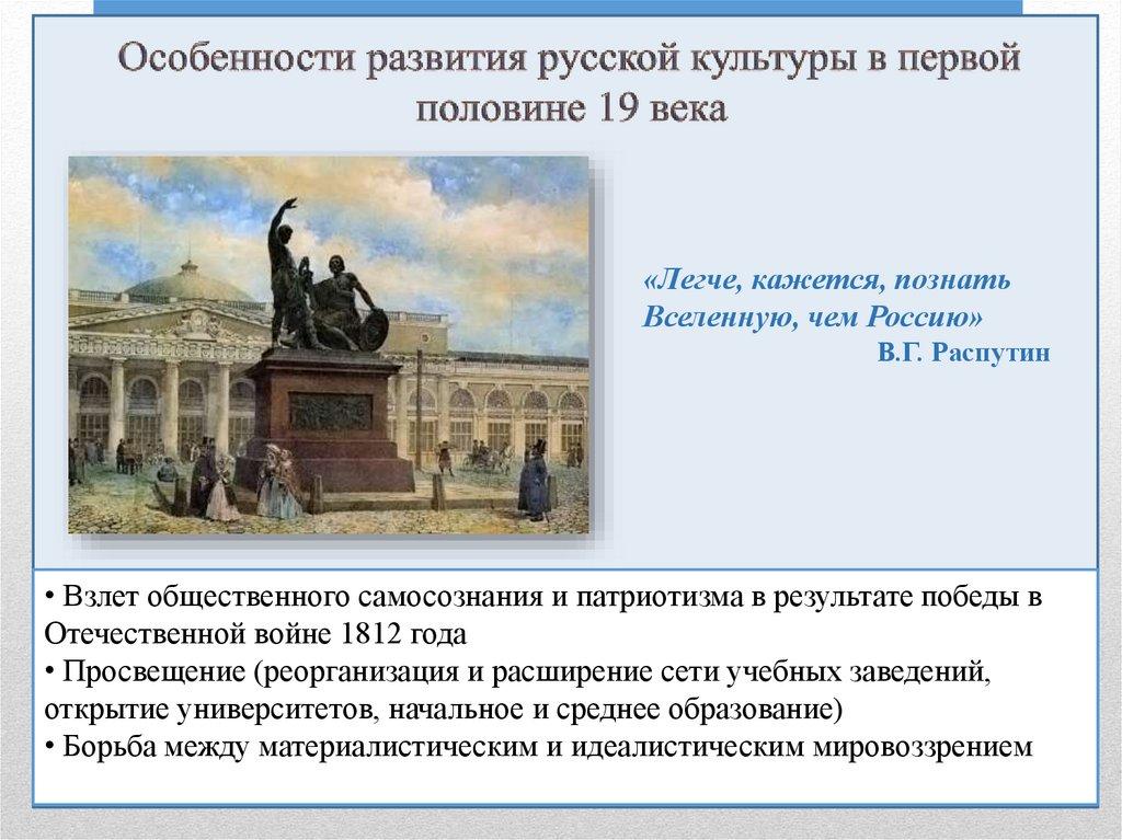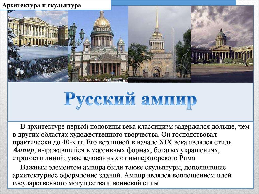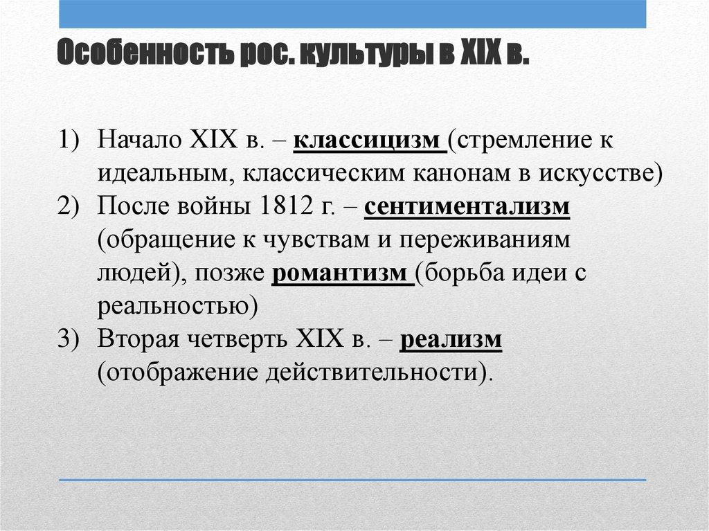 Особенность рос. культуры в XIX в.1) Начало XIX в. – классицизм (стремление к