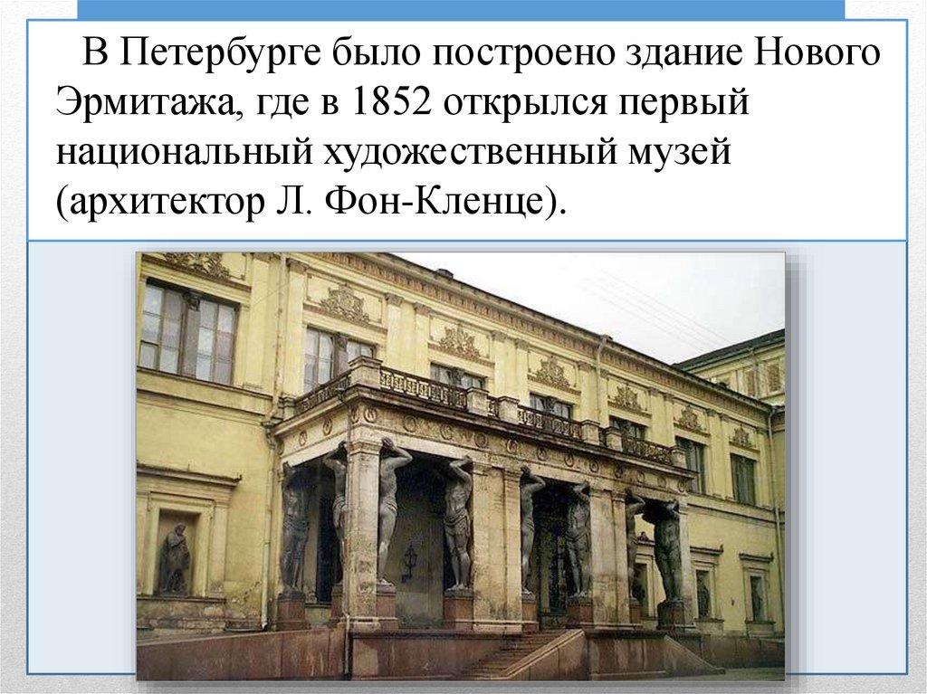 В Петербурге было построено здание НовогоЭрмитажа, где в 1852 открылся первый