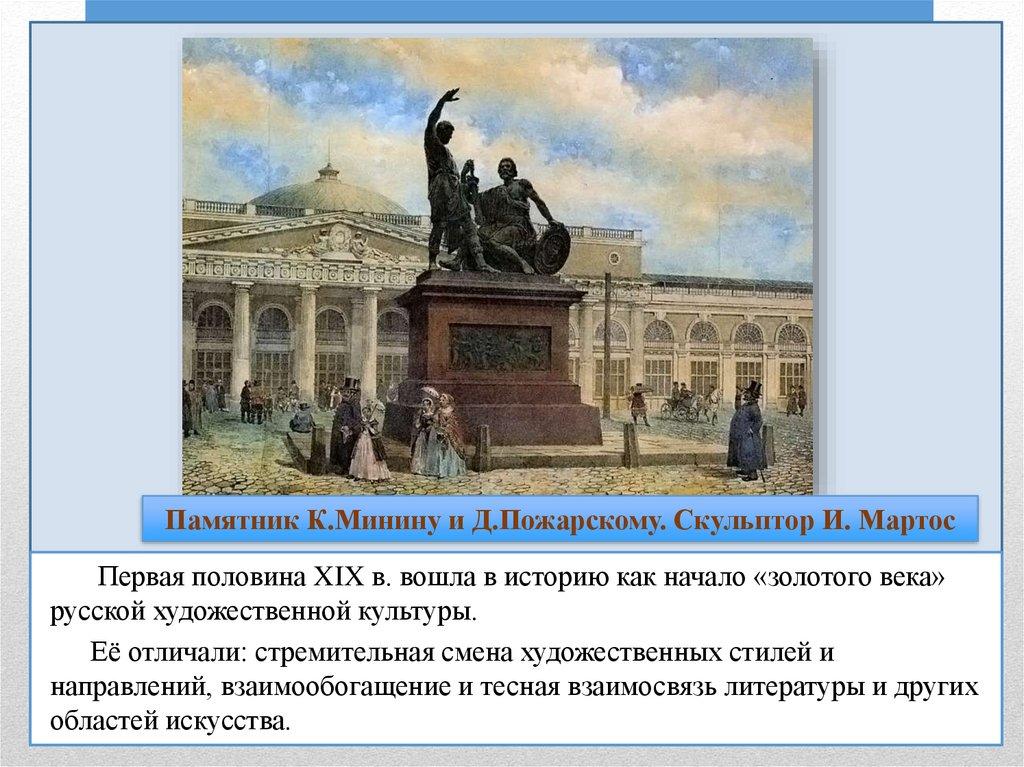Памятник К.Минину и Д.Пожарскому. Скульптор И. МартосПервая половина XIX в. вошла в историю как начало «золотого века»