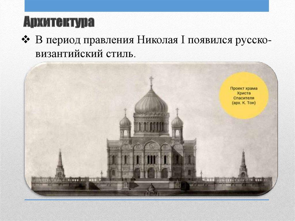 АрхитектураВ период правления Николая I появился руссковизантийский стиль.