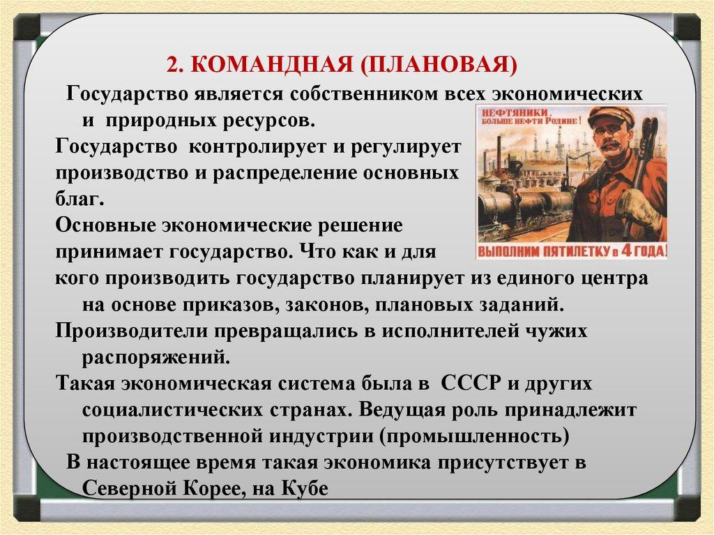 2. КОМАНДНАЯ (ПЛАНОВАЯ)Государство является собственником всех экономических