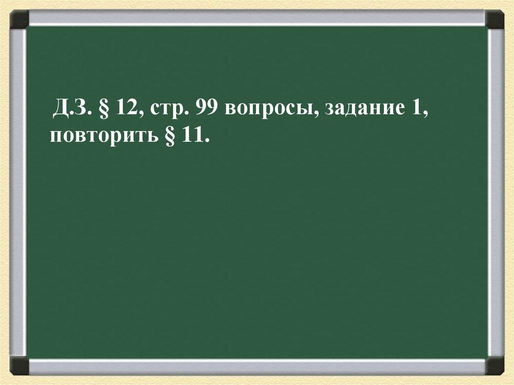 Д.З. § 12, стр. 99 вопросы, задание 1,повторить § 11.
