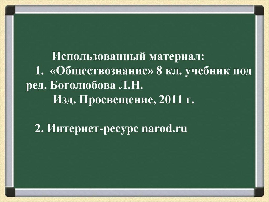 Использованный материал:1. «Обществознание» 8 кл. учебник под
