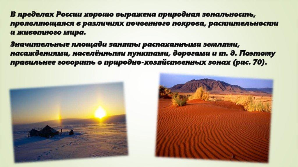 В пределах России хорошо выражена природная зональность,проявляющаяся в различиях почвенного покрова, растительности