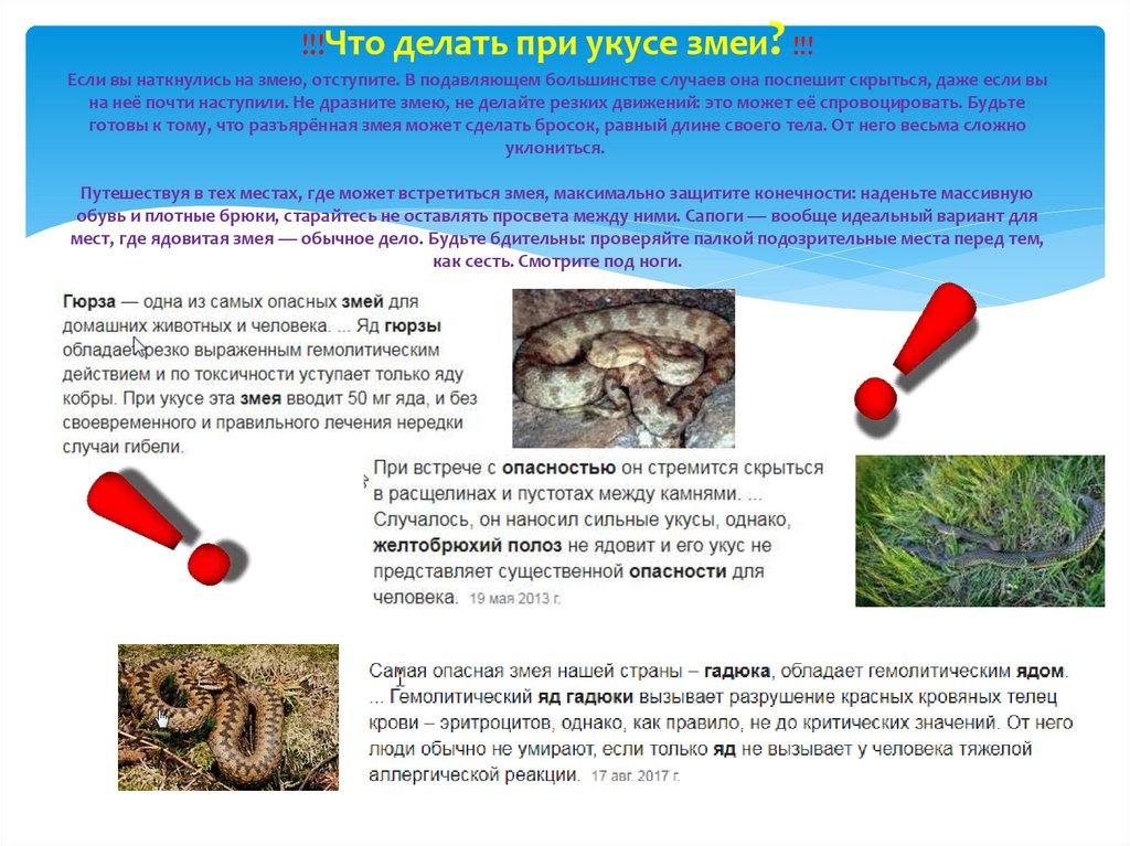 !!!Что делать при укусе змеи? !!!Если вы наткнулись на змею, отступите. В подавляющем большинстве случаев она поспешит скрыться, даже если вы