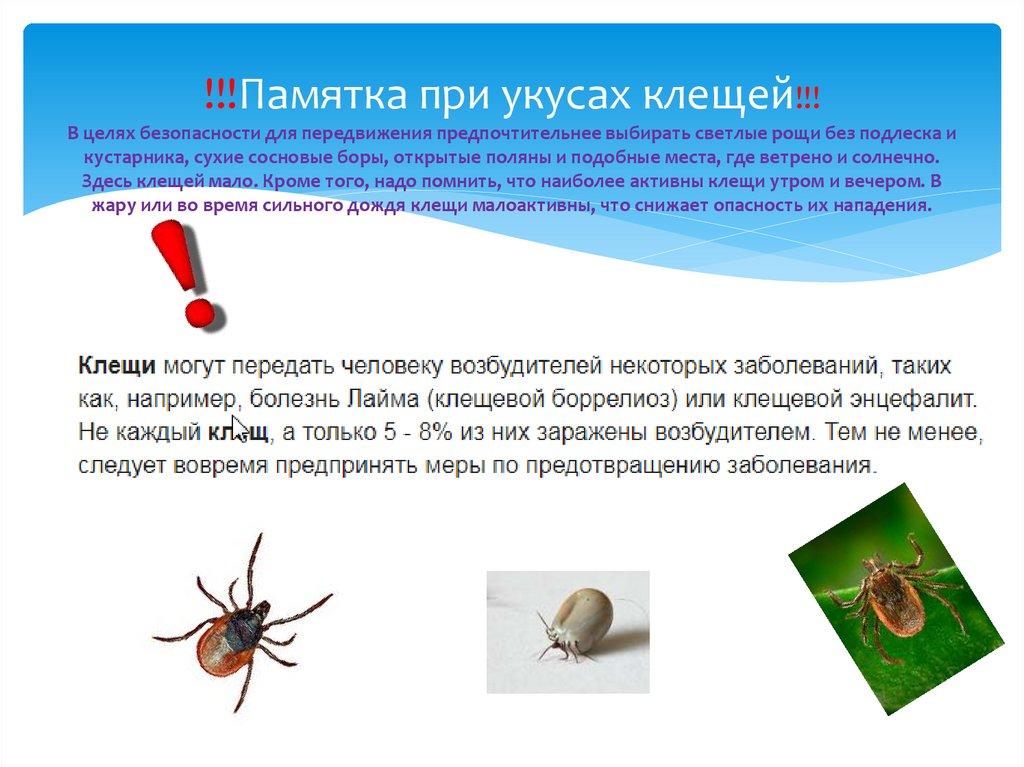 !!!Памятка при укусах клещей!!!В целях безопасности для передвижения предпочтительнее выбирать светлые рощи без подлеска и