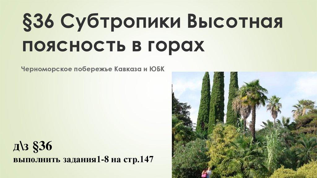Субтропики. Высотная поясность в горах .Черноморское побережье Кавказа и ЮБК. (§36)