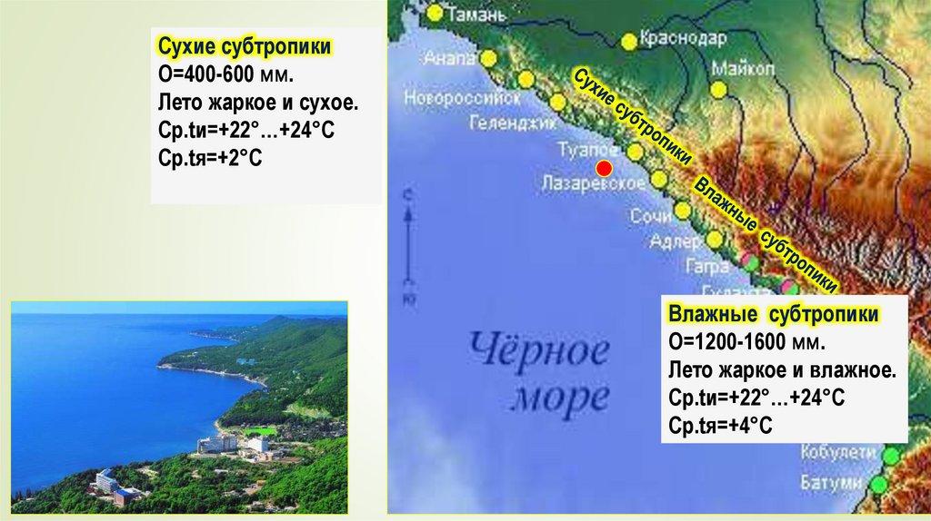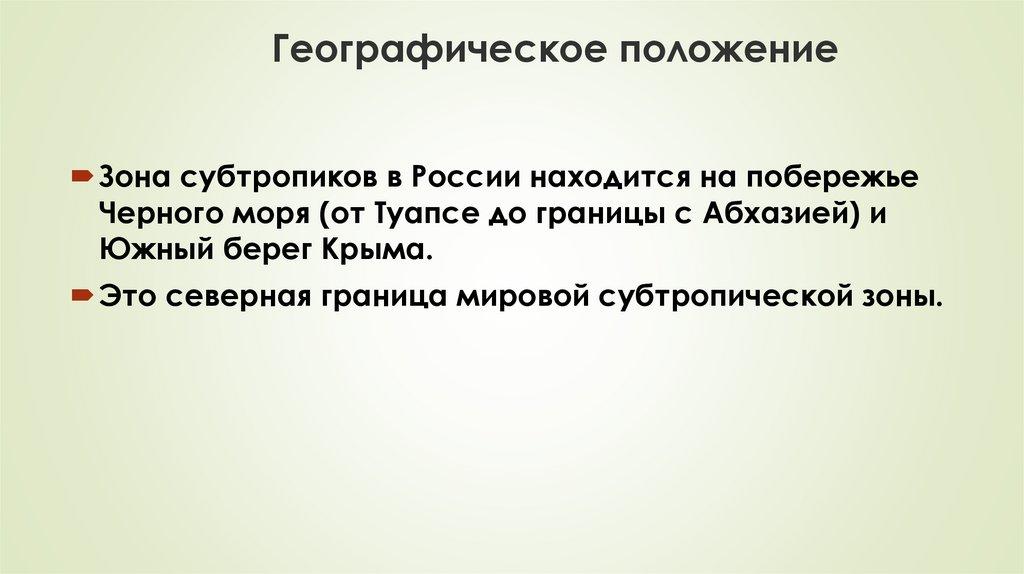 Географическое положениеЗона субтропиков в России находится на побережье