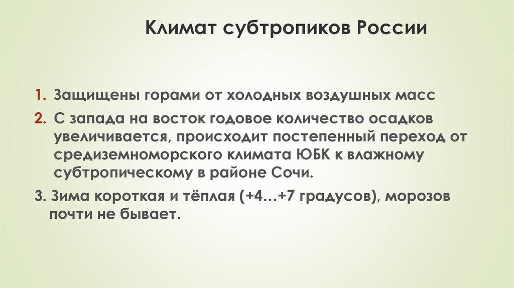 Климат субтропиков России1. Защищены горами от холодных воздушных масс