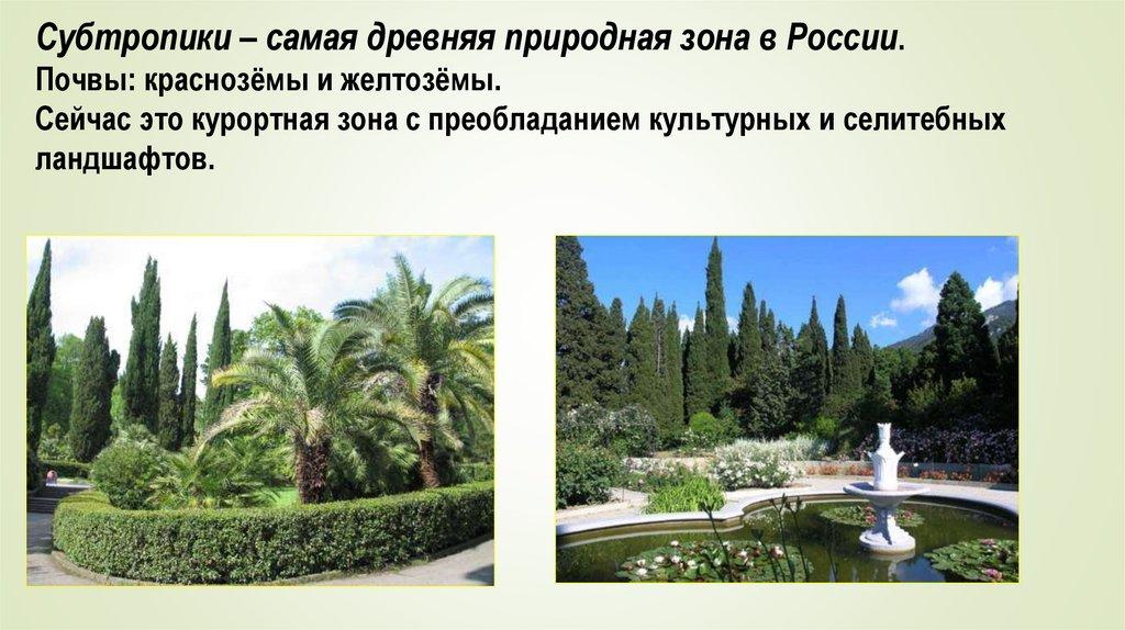 Субтропики – самая древняя природная зона в России.Почвы: краснозёмы и желтозёмы.