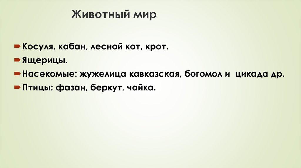 Животный мирКосуля, кабан, лесной кот, крот.