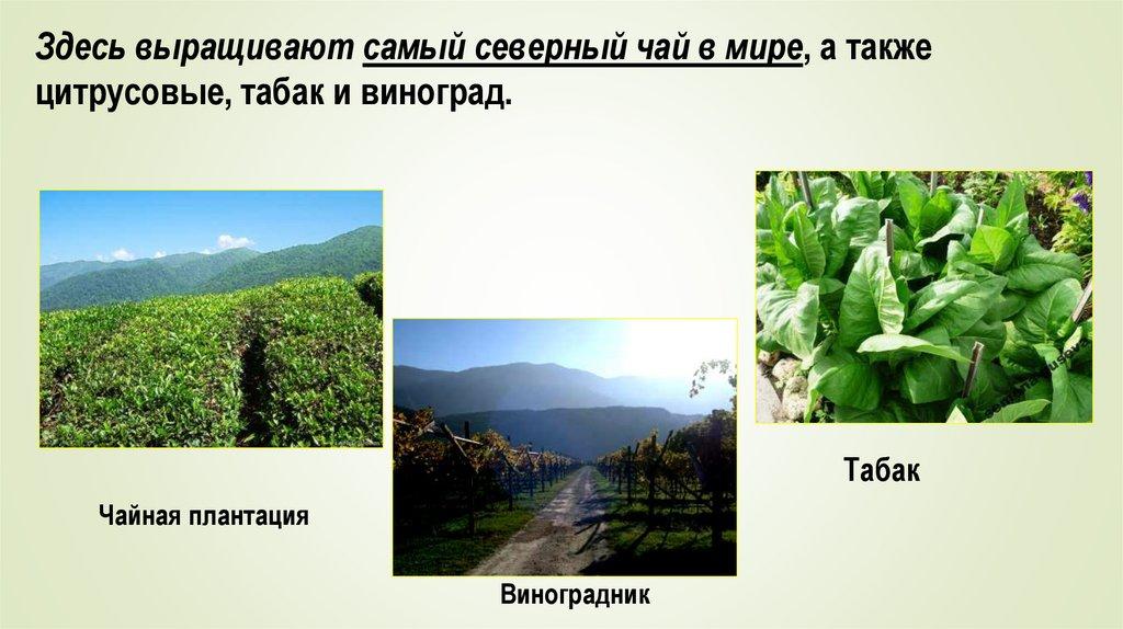 Здесь выращивают самый северный чай в мире, а такжецитрусовые, табак и виноград.