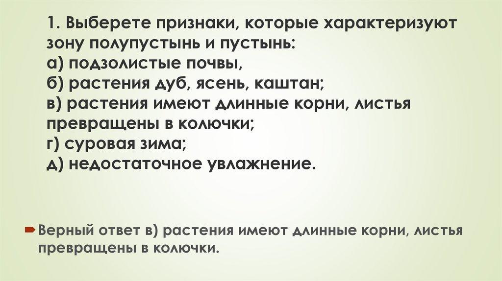 1. Выберете признаки, которые характеризуютзону полупустынь и пустынь: