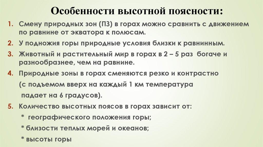 Особенности высотной поясности:1. Смену природных зон (ПЗ) в горах можно сравнить с движением