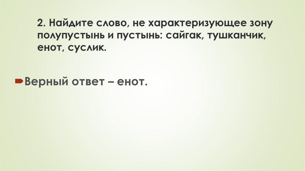 2. Найдите слово, не характеризующее зонуполупустынь и пустынь: сайгак, тушканчик,