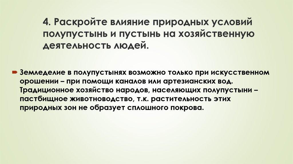 4. Раскройте влияние природных условийполупустынь и пустынь на хозяйственную