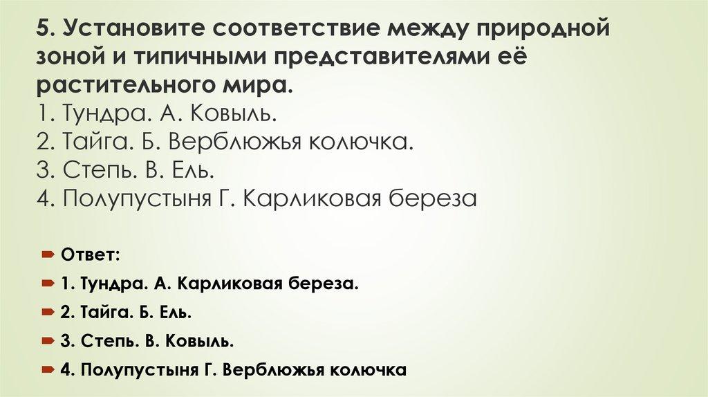 5. Установите соответствие между природнойзоной и типичными представителями её