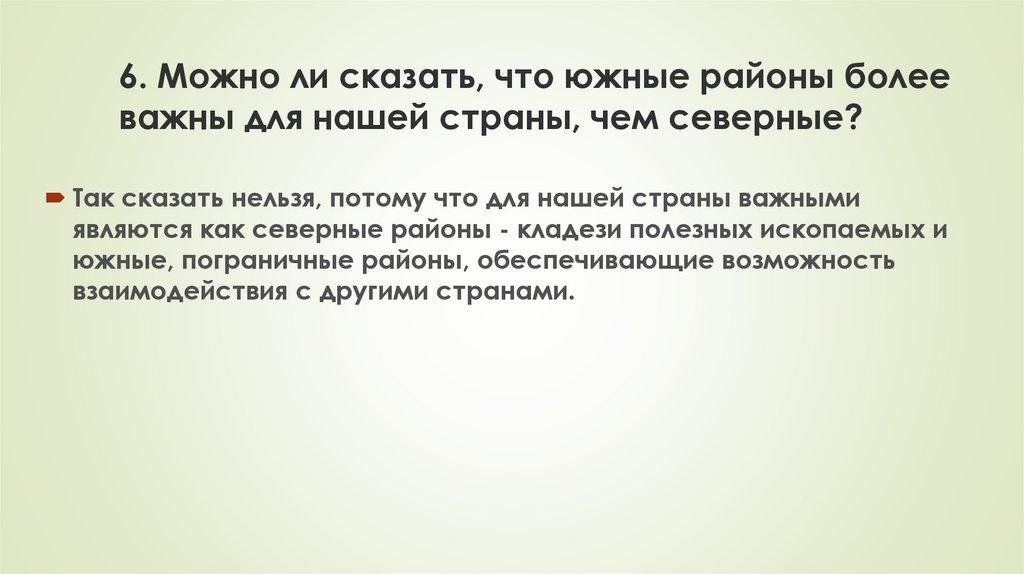 6. Можно ли сказать, что южные районы болееважны для нашей страны, чем северные?