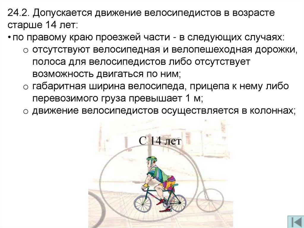 24.2. Допускается движение велосипедистов в возрастестарше 14 лет: