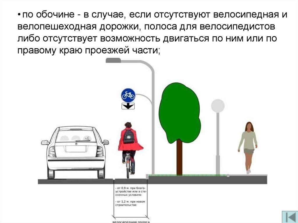 • по обочине - в случае, если отсутствуют велосипедная ивелопешеходная дорожки, полоса для велосипедистов
