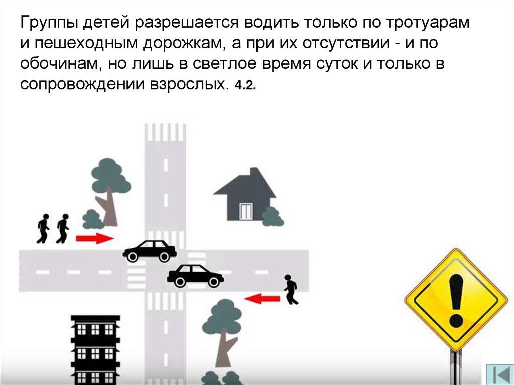 Группы детей разрешается водить только по тротуарами пешеходным дорожкам, а при их отсутствии - и по