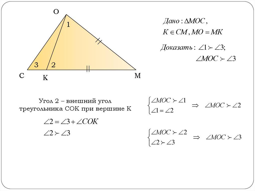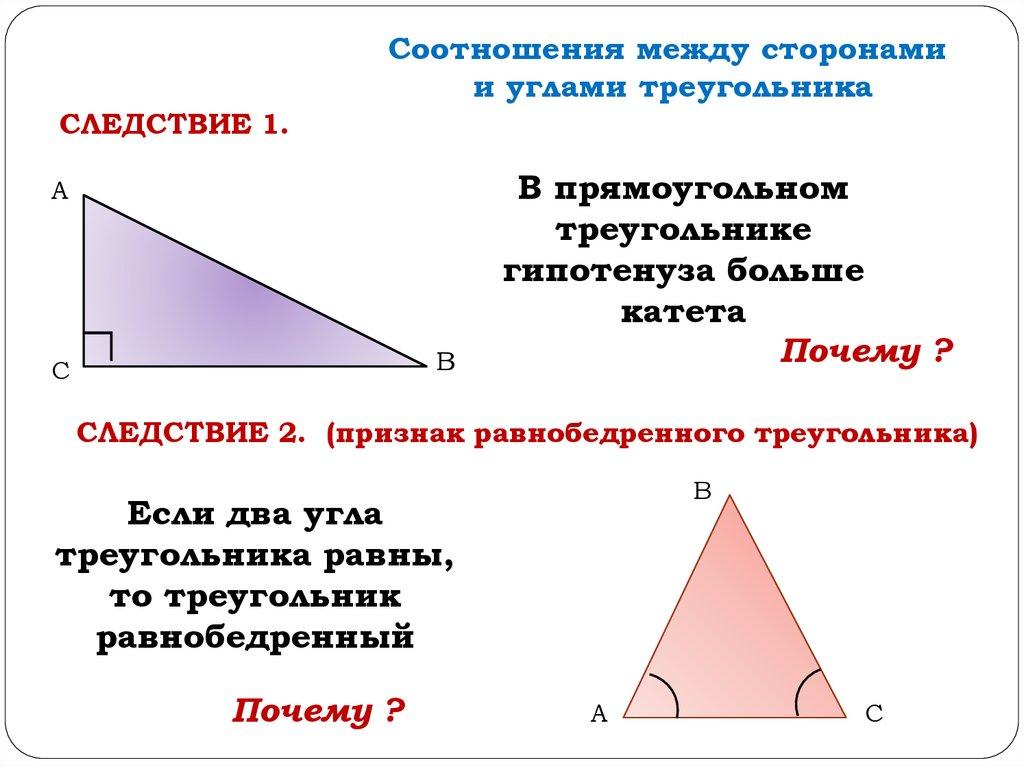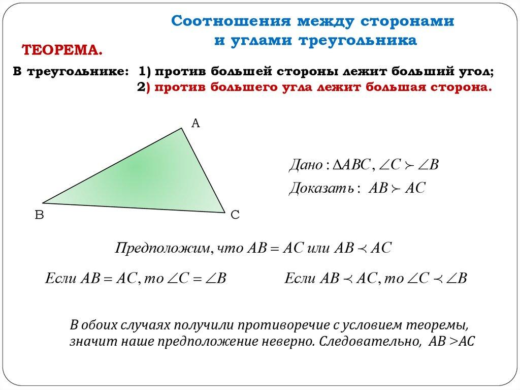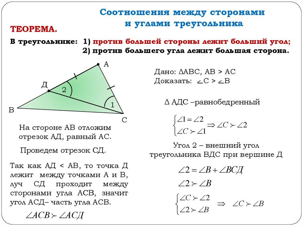 В треугольнике: 1) против большей стороны лежит больший угол;