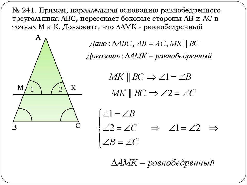 № 241. Прямая, параллельная основанию равнобедренноготреугольника АВС, пересекает боковые стороны АВ и АС в