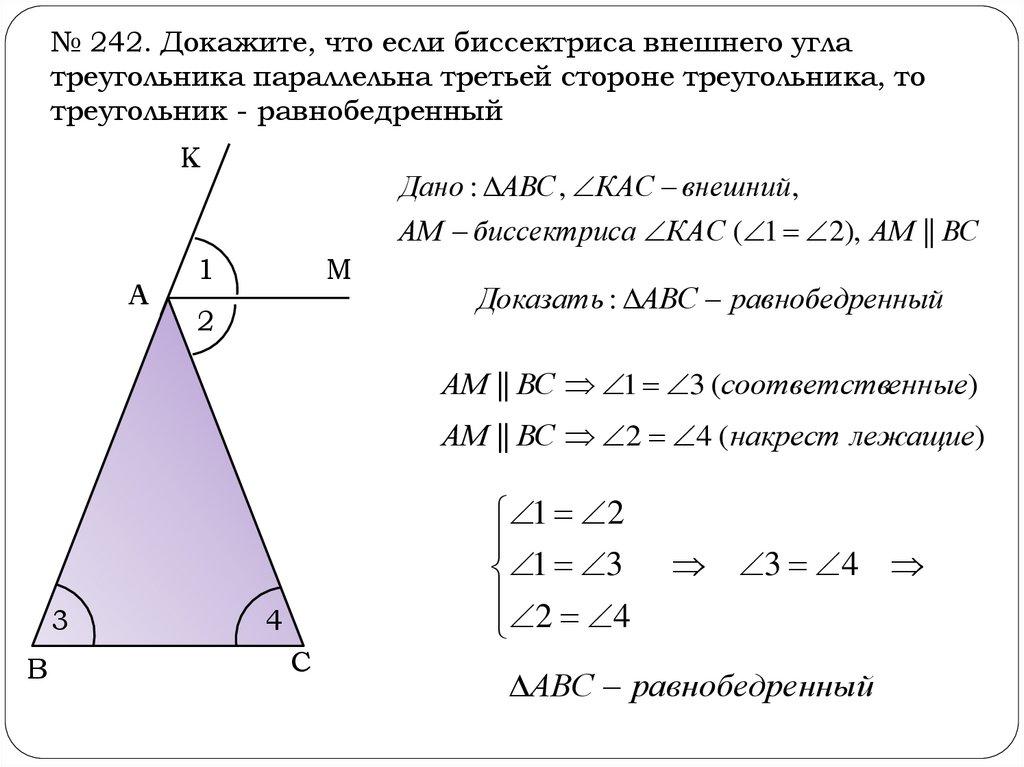 № 242. Докажите, что если биссектриса внешнего углатреугольника параллельна третьей стороне треугольника, то