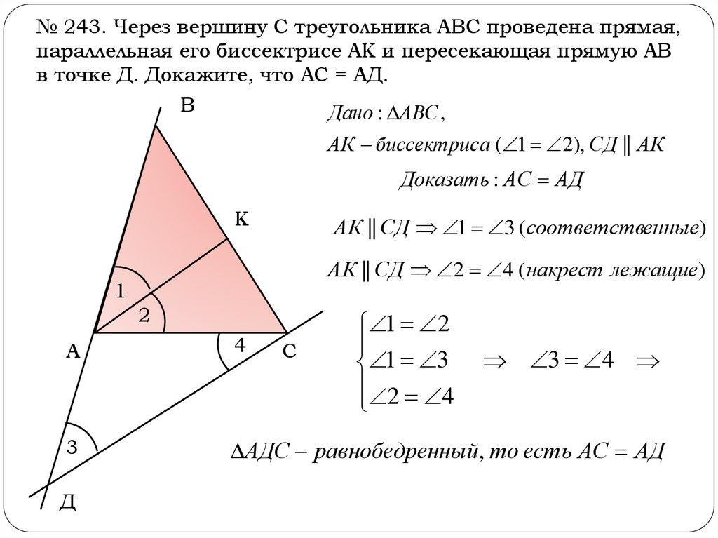 № 243. Через вершину С треугольника АВС проведена прямая,параллельная его биссектрисе АК и пересекающая прямую АВ