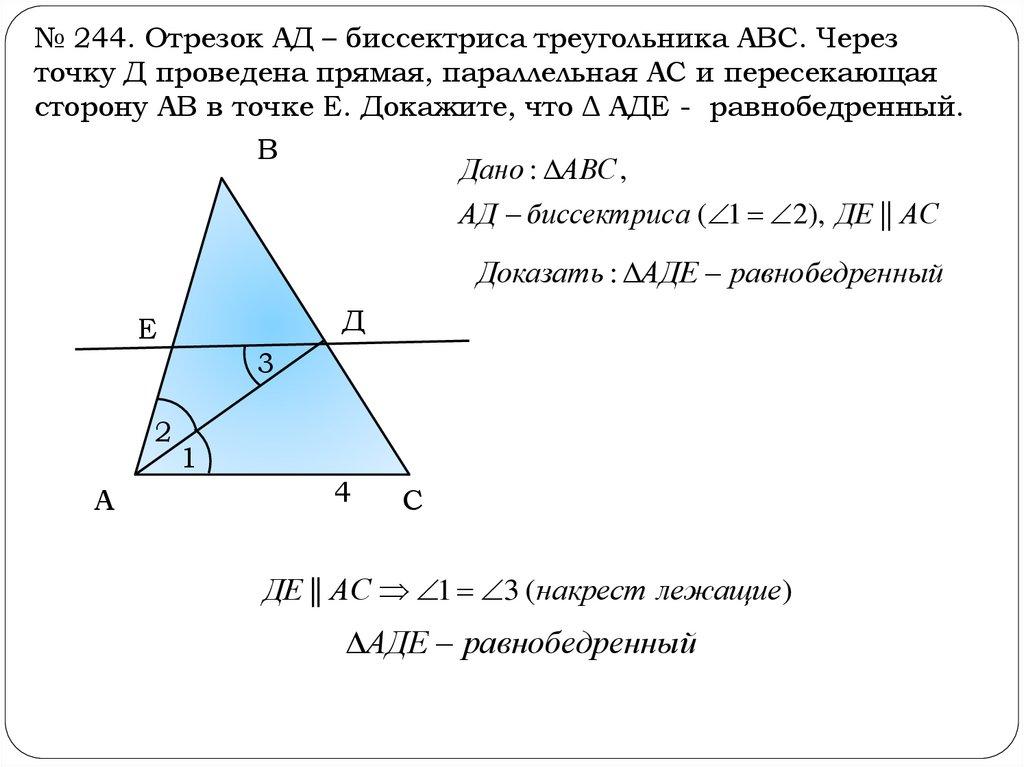 № 244. Отрезок АД – биссектриса треугольника АВС. Черезточку Д проведена прямая, параллельная АС и пересекающая
