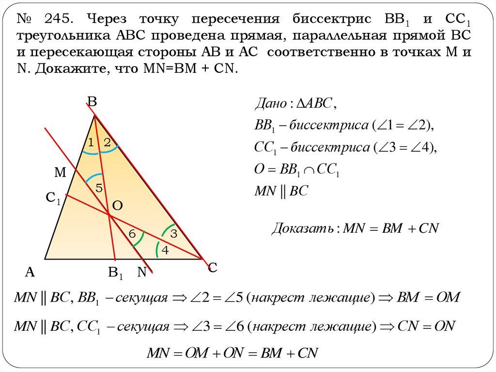 № 245. Через точку пересечения биссектрис ВB1 и СC1треугольника АВС проведена прямая, параллельная прямой ВС